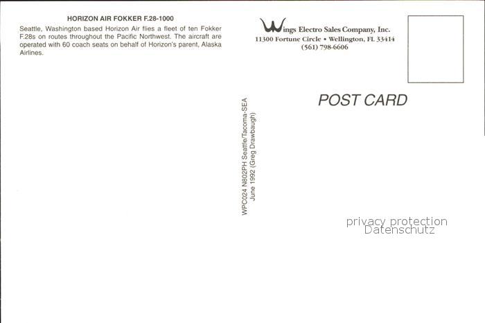Flugzeuge Zivil Horizon Air Fokker F.28-1000 N802PH postalisch nicht gelaufen Erhaltung siehe scans