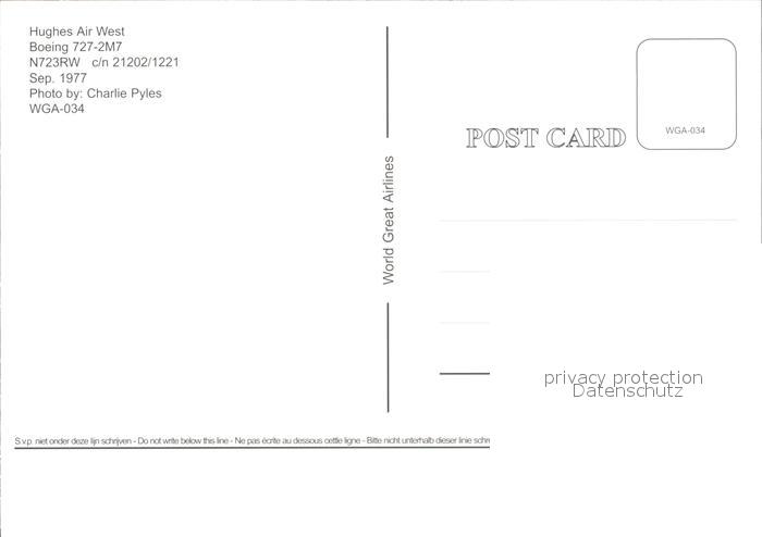 Flugzeuge Zivil Hughes Air West Boeing 727-2M7 N723RW c/n 21202/1221 postalisch nicht gelaufen Erhaltung siehe scans