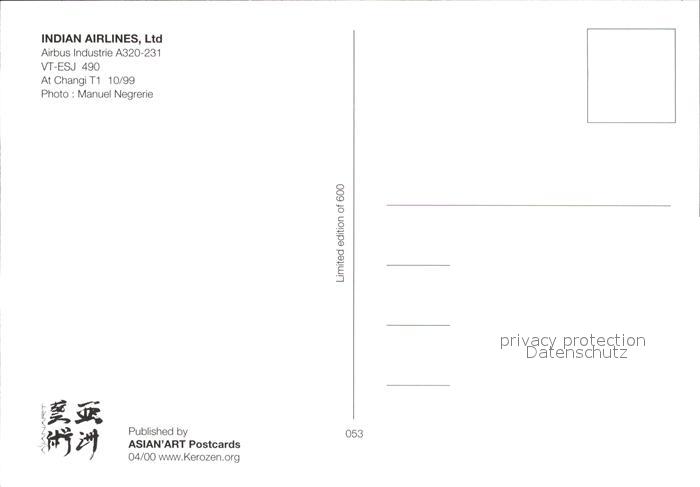 Flugzeuge Zivil Indian Airlines Ltd Airbus Industrie A320-231 VT-ESJ 490 postalisch nicht gelaufen Erhaltung siehe scans