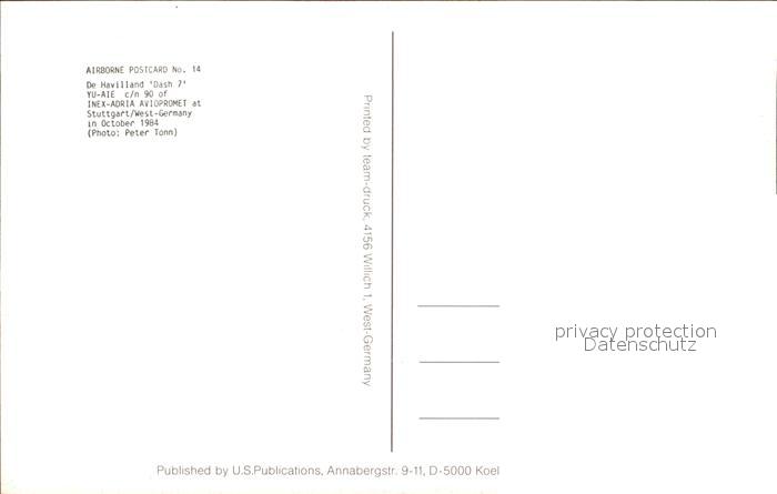 Flugzeuge Zivil Inex-Adria Aviopromet De Havilland Dash 7 YU-AIE c/n 90 postalisch nicht gelaufen Erhaltung siehe scans