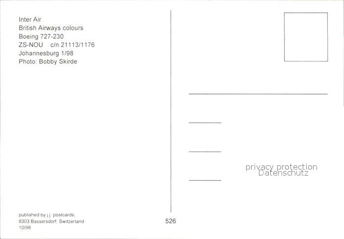 Flugzeuge Zivil Inter Air British Airways Boeing 727-230 ZS-NOU c/n 21113/1176 postalisch nicht gelaufen Erhaltung siehe scans