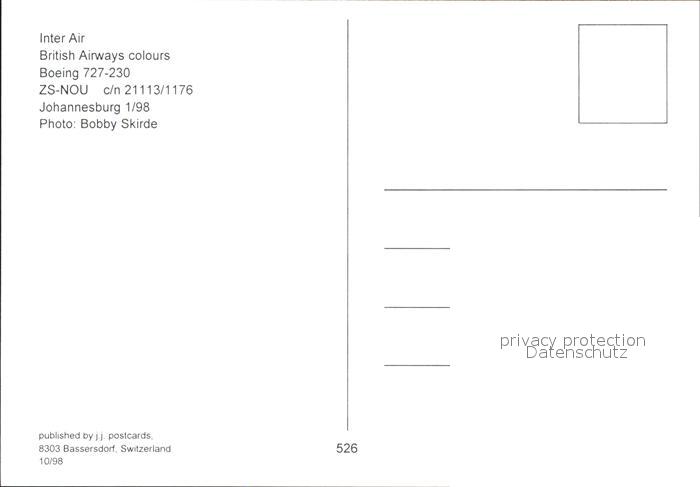 Flugzeuge Zivil Inter Air British Airways Boeing 727-230 ZS-NOU c/n 21113/1176 postalisch nicht gelaufen Erhaltung siehe scans