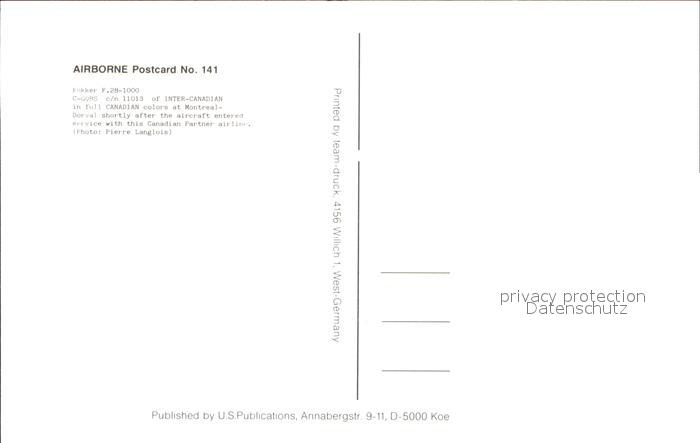 Flugzeuge Zivil Inter Canadian Fokker F28-1000 C-GQBS c/n 11013 postalisch nicht gelaufen Erhaltung siehe scans