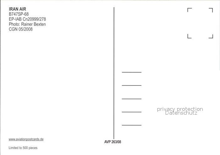 Flugzeuge Zivil Iran Air B747SP-68 EP-IAB Cn 20999/278 postalisch nicht gelaufen Erhaltung siehe scans