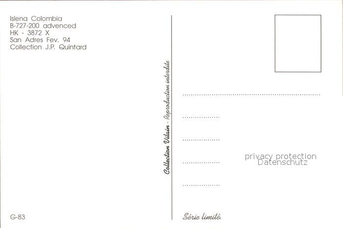 Flugzeuge Zivil Islena Colombia B-727-200 advenced HK-3872X postalisch nicht gelaufen Erhaltung siehe scans