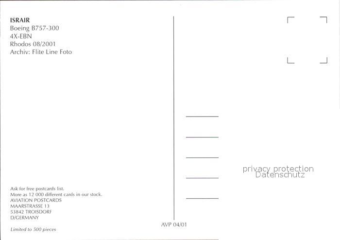 Flugzeuge Zivil Israir Boeing B757-300 4X-EBN postalisch nicht gelaufen Erhaltung siehe scans