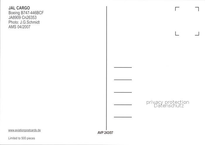 Flugzeuge Zivil JAL Cargo Boeing 747-446BCF JA8909 Cn 26353 postalisch nicht gelaufen Erhaltung siehe scans