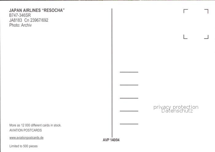 Flugzeuge Zivil Japan Airines Resocha B747-346SR JA8183 cn 23967/692 postalisch nicht gelaufen Erhaltung siehe scans