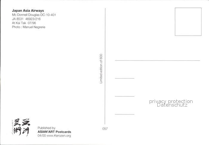 Flugzeuge Zivil Japan Asia Airways McDonnell Douglas DC-10-401 JA8531 postalisch nicht gelaufen Erhaltung siehe scans