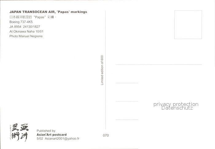 Flugzeuge Zivil Japan Transocean Air Papas Boeing 737-4K5 JA-8954 postalisch nicht gelaufen Erhaltung siehe scans