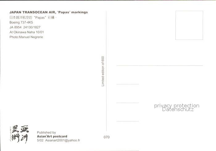 Flugzeuge Zivil Japan Transocean Air Papas markings JA8954 24130/1827 postalisch nicht gelaufen Erhaltung siehe scans