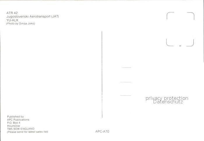 Flugzeuge Zivil Jugoslovenski Aerotransport JAT ATR-42 YU-ALK postalisch nicht gelaufen Erhaltung siehe scans