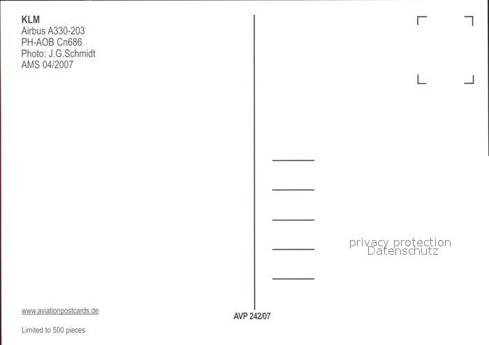 Flugzeuge Zivil KLM Airbus 330-203 PH-AOB Cn686 postalisch nicht gelaufen Erhaltung siehe scans