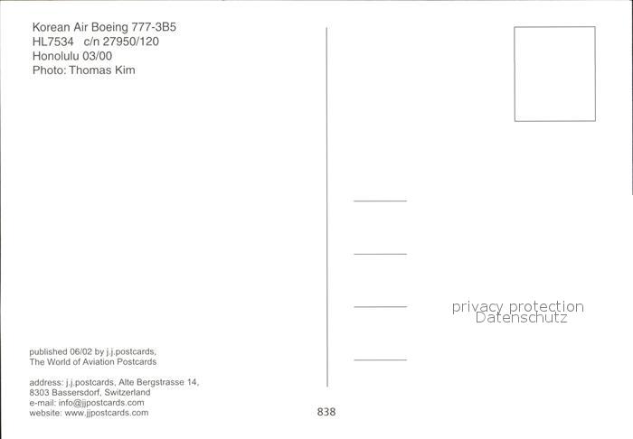 Flugzeuge Zivil Korean Air Boeing 777-3B5 HL7534 c/n 27950/120 postalisch nicht gelaufen Erhaltung siehe scans