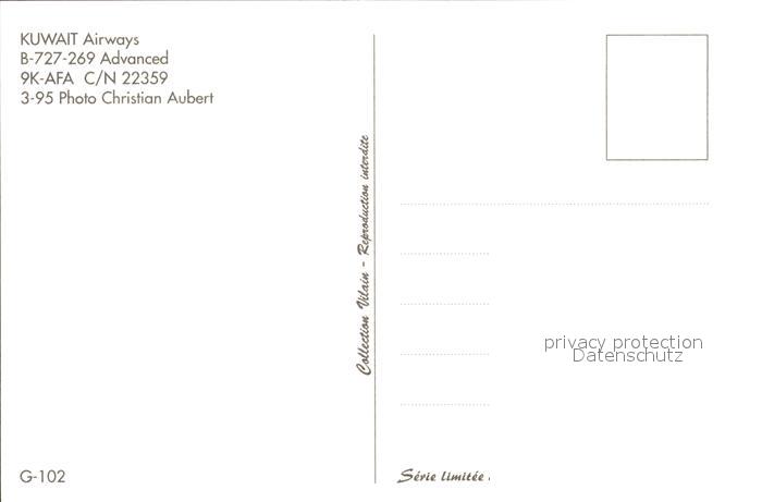 Flugzeuge zivil Kuwait Airways B-727-269 Advanced 9K-AFA C/N 22359 postalisch nicht gelaufen Erhaltung siehe scans