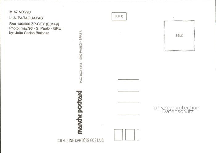 Flugzeuge Zivil L.A. Paraguyays BAe 156-300 ZP-CCY S.Paulo GRU postalisch nicht gelaufen Erhaltung siehe scans