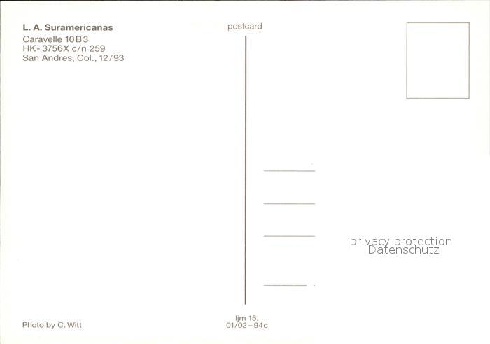Flugzeuge Zivil L.A. Suramericanas Caravelle 10B3 HK-3756X c/n 259 postalisch nicht gelaufen Erhaltung siehe scans