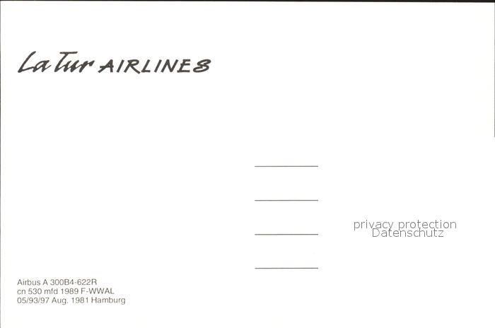 Flugzeuge Zivil La Tur Airlines Airbus A300B4-6222R cn 530 F-WWAL postalisch nicht gelaufen Erhaltung siehe scans