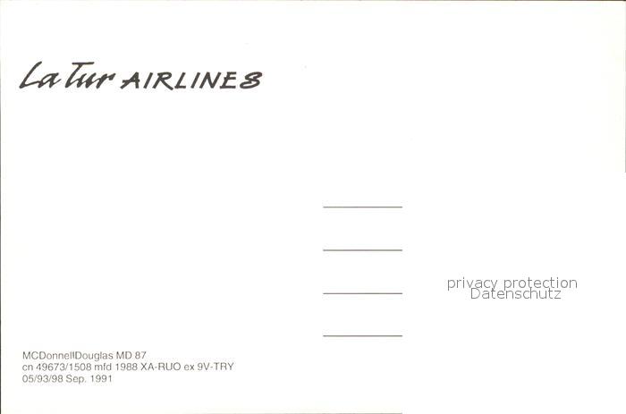 Flugzeuge Zivil La Tur Airlines McDonnell Douglas MD 87 cn 49673/1508XA-RUO postalisch nicht gelaufen Erhaltung siehe scans