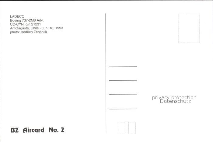 Flugzeuge zivil LADEGO Boeing 737-2M8 Adv. CC-CYN postalisch nicht gelaufen Erhaltung siehe scans