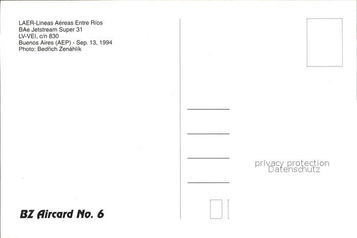 Flugzeuge Zivil LAER-Lineas Aereas Entre Rios BAe Jetstream Super 31 LV-VEI c/n 830 postalisch nicht gelaufen