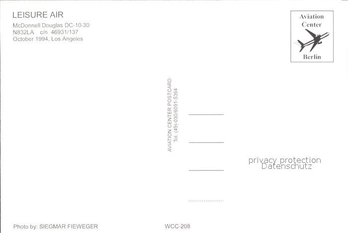 Flugzeuge Zivil Leisure Air McDonnell Douglas DC-10-30 N832LA c/n 46931/137 postalisch nicht gelaufen Erhaltung siehe scans