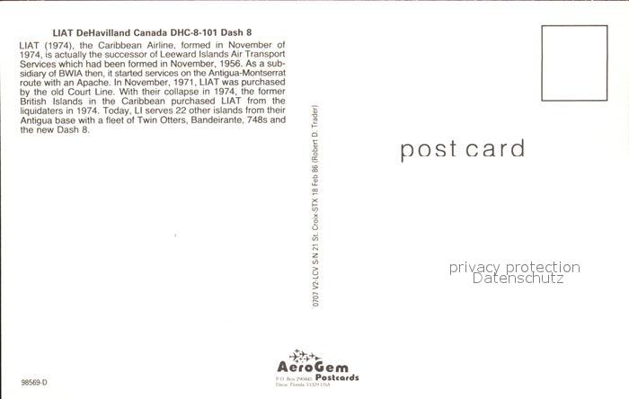 Flugzeuge Zivil LIAT DeHavilland Canada DHC-8-101 Dash 8 V2-LCV postalisch nicht gelaufen Erhaltung siehe scans