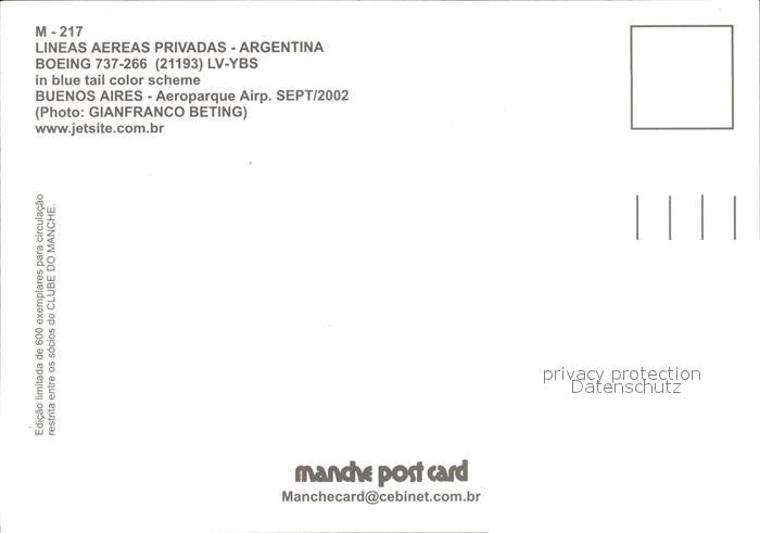 Flugzeuge Zivil Lineas Aereas Privadas Argentina Boeing 737-266 21193 LV-YBS postalisch nicht gelaufen Erhaltung siehe scans