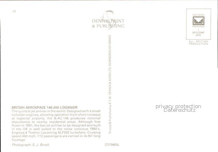 Flugzeuge Zivil Loganair British Aerospace 146-200 G-OLCA postalisch nicht gelaufen Erhaltung siehe scans