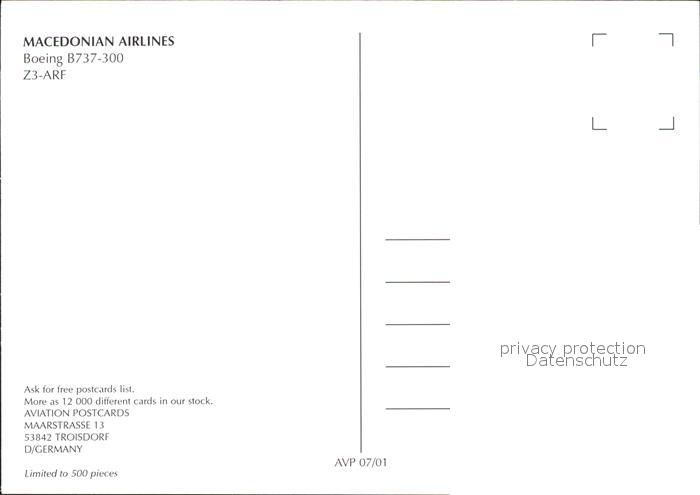 Flugzeuge Zivil Macedonian Airlines MAT Boeing B737-300 Z3-ARF postalisch nicht gelaufen