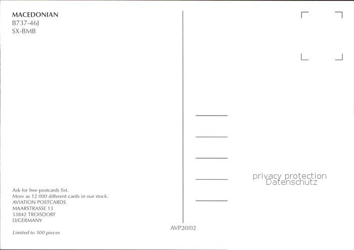 Flugzeuge Zivil Macedonian B737-46J SX-BMB postalisch nicht gelaufen Erhaltung siehe scans