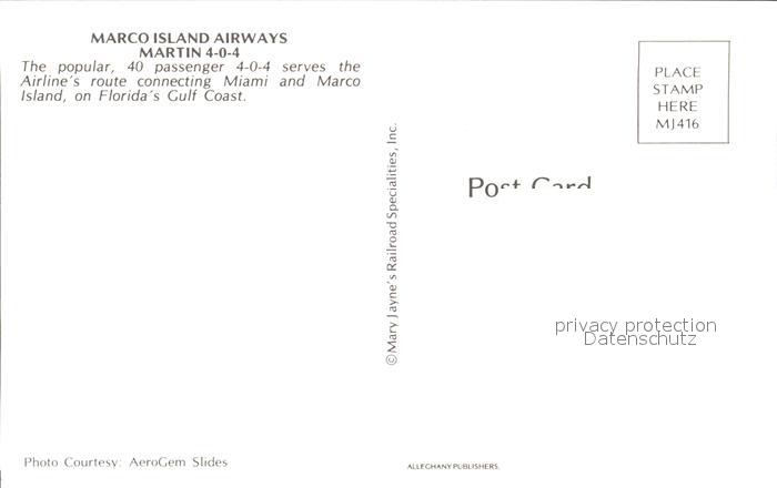Flugzeuge Zivil Marco Island Airways Martin 4-0-4 N968M postalisch nicht gelaufen Erhaltung siehe scans