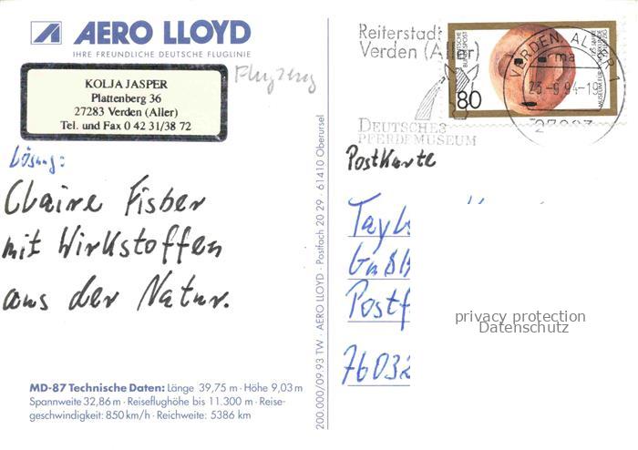 74154616 alte Postkarte FLUGZEUGE ZIVIL McDonnell Douglas MD 87 postalisch gelaufen Erhaltung siehe scans [SanaeD93] KatCode: 22120000001300
