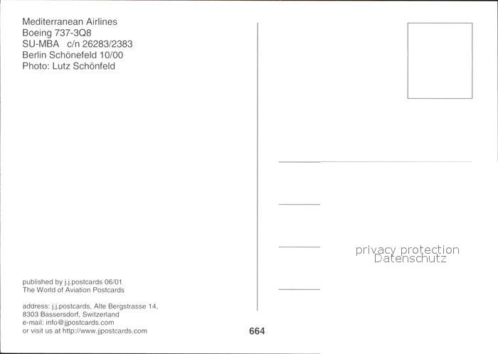 Flugzeuge Zivil Mediterranean Airlines Boeing 737-3Q8 SU-MBA c/n 26283/2383 postalisch nicht gelaufen Erhaltung siehe scans