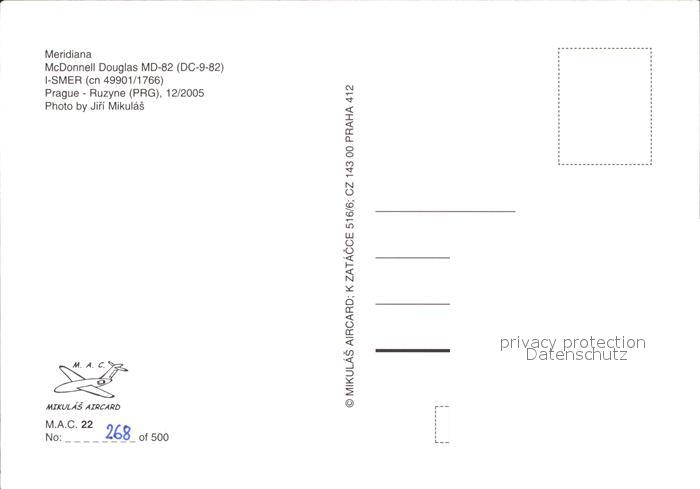 Flugzeuge Zivil Meridiana McDonnell Douglas MD-82 DC-9-82 I-SMER cn 49901/1766 postalisch nicht gelaufen Erhaltung siehe scans