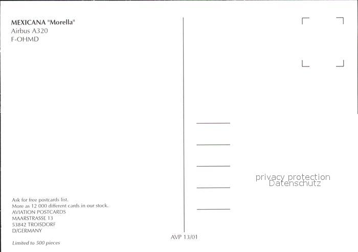 Flugzeuge Zivil Mexicana Morella A320 F-OHMD postalisch nicht gelaufen Erhaltung siehe scans