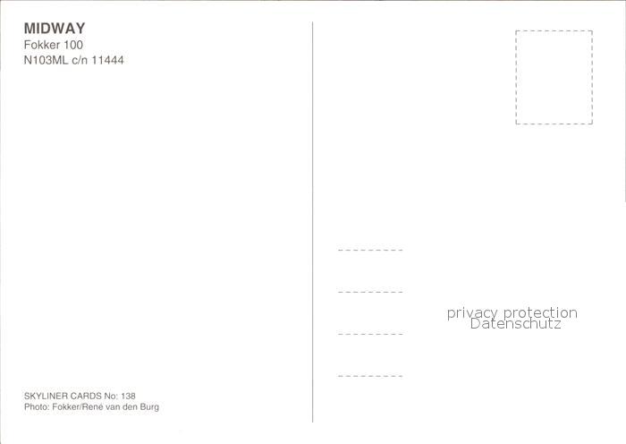 Flugzeuge Zivil Midway Fokker 100 N103ML c/n 11444 postalisch nicht gelaufen Erhaltung siehe scans