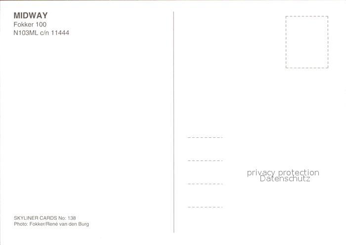 Flugzeuge Zivil Midway Fokker 100 N103ML c/n 11444 postalisch nicht gelaufen Erhaltung siehe scans
