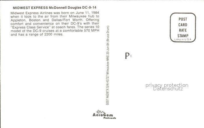 Flugzeuge Zivil Midwest Express McDonnell Douglas DC-9-14 postalisch nicht gelaufen Erhaltung siehe scans