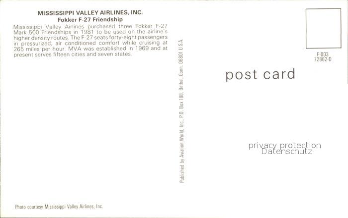 Flugzeuge Zivil Mississippi Valley Airlines Fokker F-27 Friendship N334MV postalisch nicht gelaufen Erhaltung siehe scans