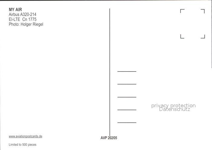 Flugzeuge Zivil My Air Airbus A320-214 EI-LTE Cn 1775 postalisch nicht gelaufen Erhaltung siehe scans