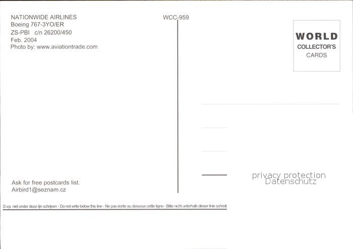 Flugzeuge Zivil Nationwide Airlines Boeing 767-3YO/ER ZS-PBI c/n 26200/450 postalisch nicht gelaufen