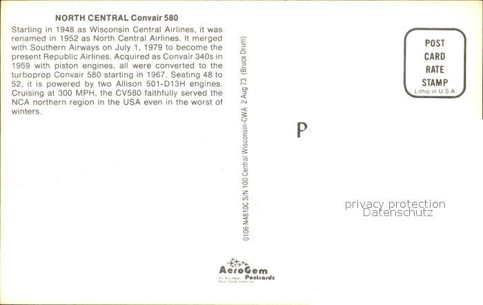 Flugzeuge Zivil North Central Convair 580 postalisch nicht gelaufen Erhaltung siehe scans