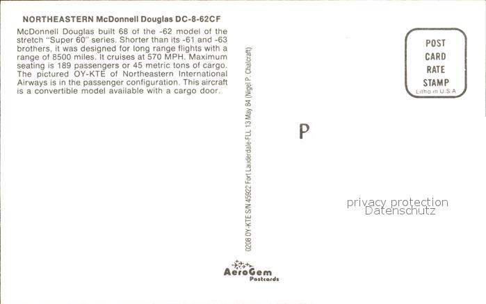 Flugzeuge Zivil Northeastern McDonnell Douglas DC-8-62CF postalisch nicht gelaufen Erhaltung siehe scans