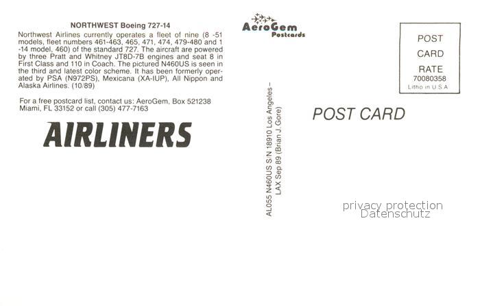 Flugzeuge Zivil Northwest Airlines Boeing 727-14 postalisch nicht gelaufen Erhaltung siehe scans [PaolaD17]