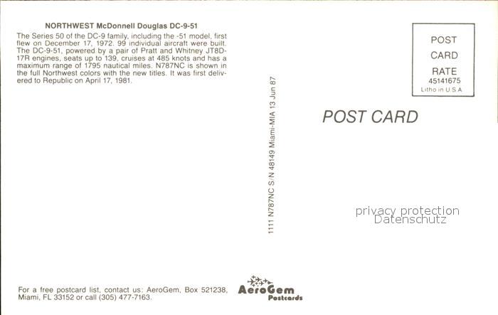 Flugzeuge Zivil Northwest McDonnell Douglas DC-9-51 N787NC s/n 48149 postalisch nicht gelaufen Erhaltung siehe scans