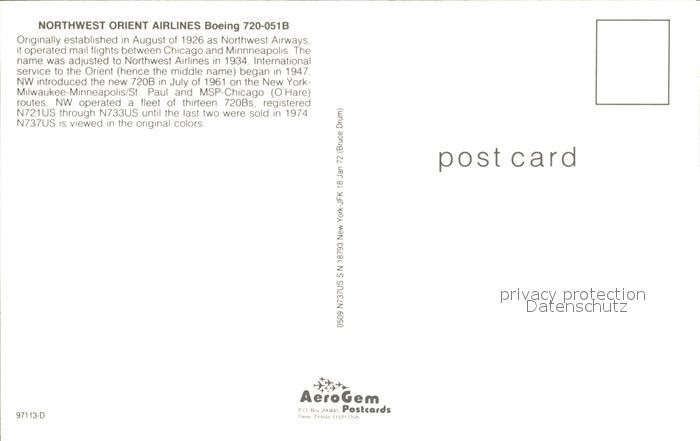 Flugzeuge Zivil Northwest Orient Airlines Boeing 720-051B postalisch nicht gelaufen Erhaltung siehe scans