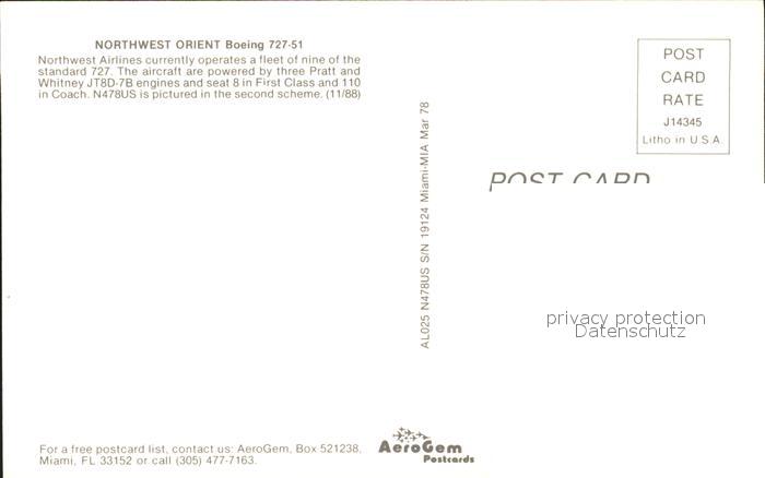 Flugzeuge Zivil Northwest Orient Boeing 727-51 AL025 N478US S/N 19124 postalisch nicht gelaufen Erhaltung siehe scans