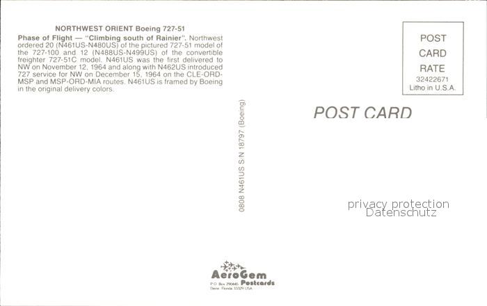 Flugzeuge Zivil Northwest Orient Boeing 727-51 N461U S/N 18797 postalisch nicht gelaufen Erhaltung siehe scans