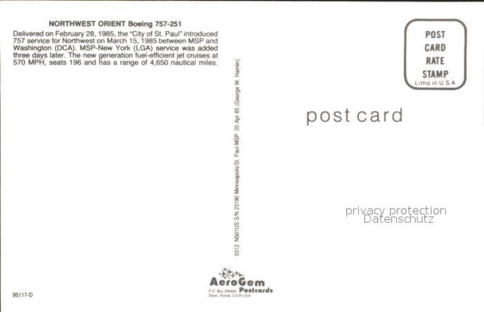 Flugzeuge Zivil Northwest Orient Boeing 757-251 postalisch nicht gelaufen Erhaltung siehe scans